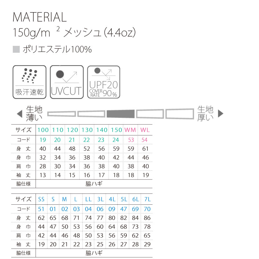 吸汗速乾性に優れたメッシュ素材を採用し、汗をすばやく吸収して外へ発散。常にサラッとした肌触りを保ちます。通気性抜群のメッシュ構造が熱や湿気を逃がし、長時間の着用でも快適さをキープ。スポーツや屋外イベントなど、汗をかくシーンでも快適に過ごせる高機能な素材です。