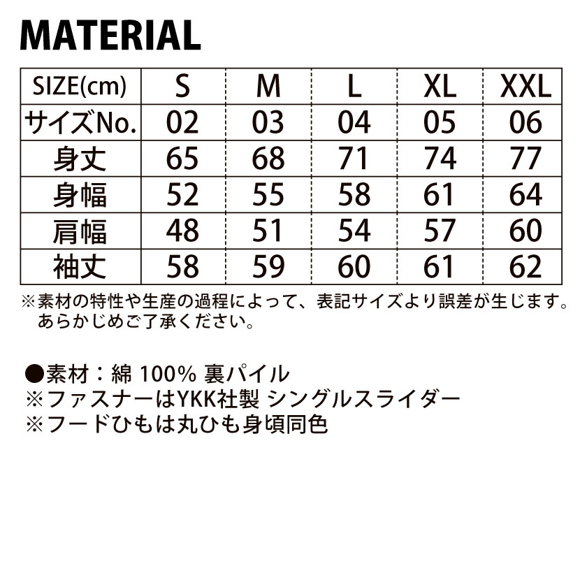 | 素材 | 綿 100% 裏パイル ※ファスナーはYKK社製 シングルスライダー ※フードひもは丸ひも身頃同色 |